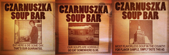 In the quiet, quaint, dry-until-a-year-ago town of Ephraim, Wisconsin, there is a soup bar called Czarnuszka Soup. A recent ad mentions that the restaurant seats 11, but having been there, I think 11 is a stretch. Weekly, the owner (Paul Wanish) publishes ads that would never be approved by anyone in advertising, ever.