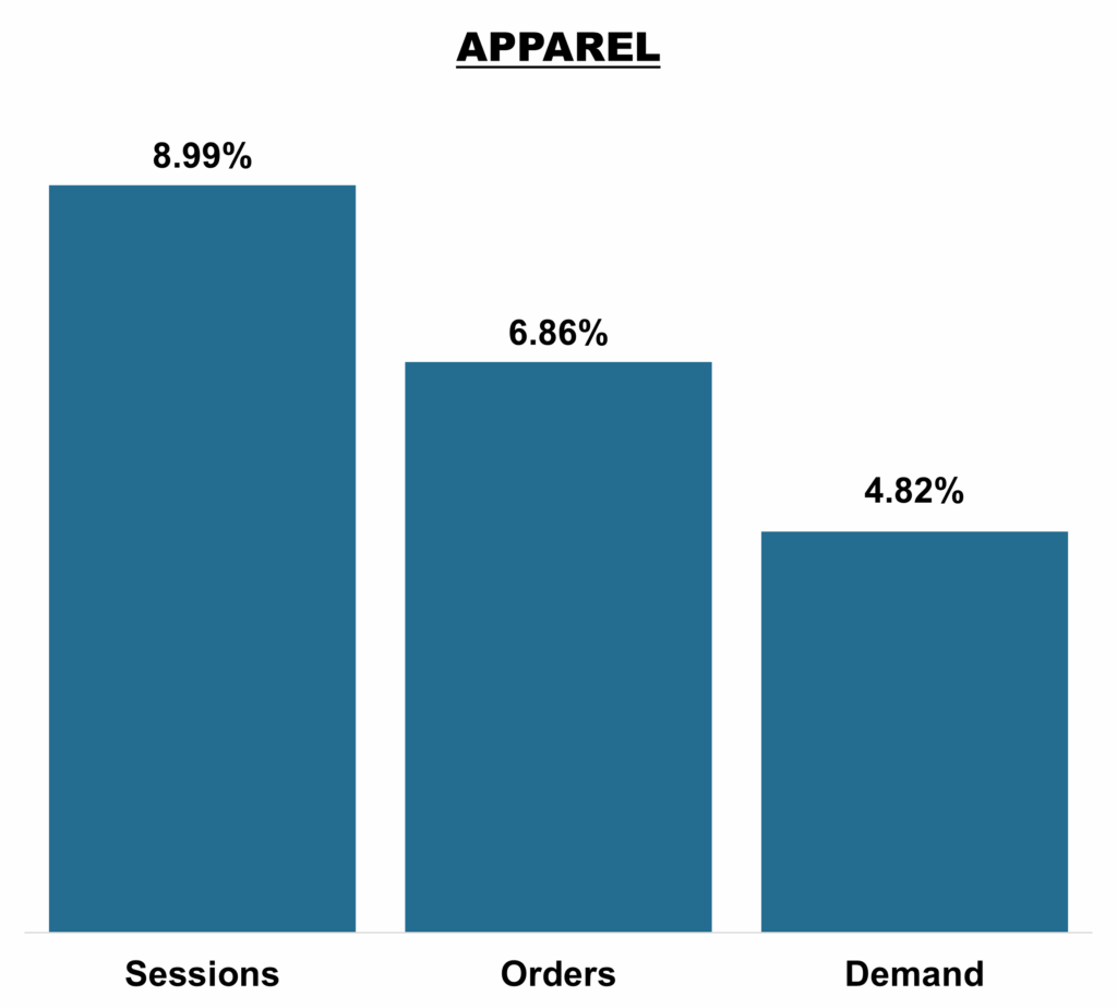 The Apparel Industry showed solid performance in August. Sessions rose +8.99%, orders increased +6.86%, and demand grew +4.82%, signaling stronger consumer engagement and spending.