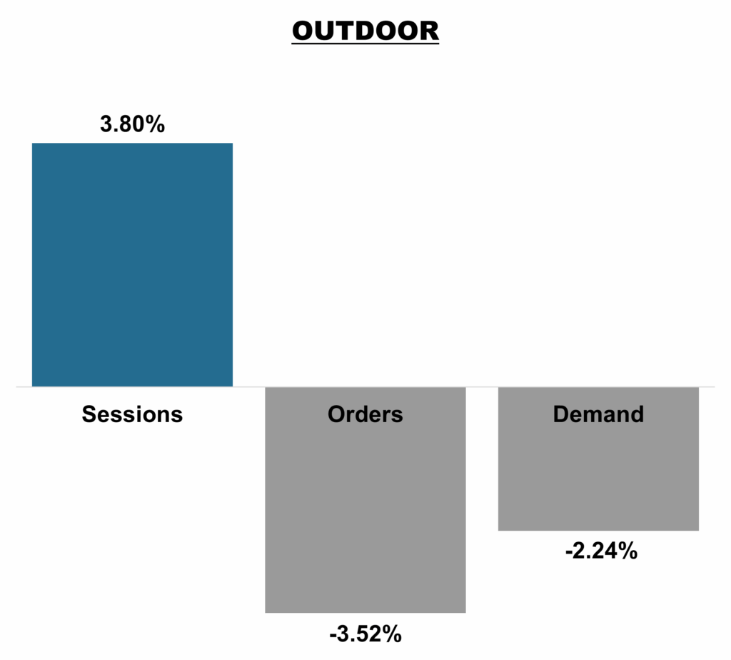 The Outdoor Industry lost momentum in August, with sessions growth easing to +3.80%, orders declining –3.52%, and demand falling into negative territory at –2.24%. Despite the pullback, traffic remains healthy, indicating sustained interest.