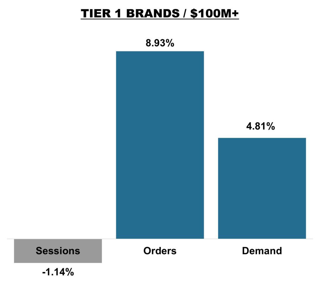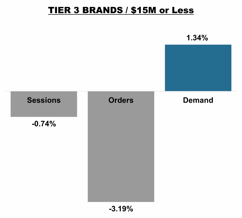 Tier 3 brands showed signs of softness in August, with sessions down -0.74% and orders declining -3.19%, while demand edged up +1.34%.