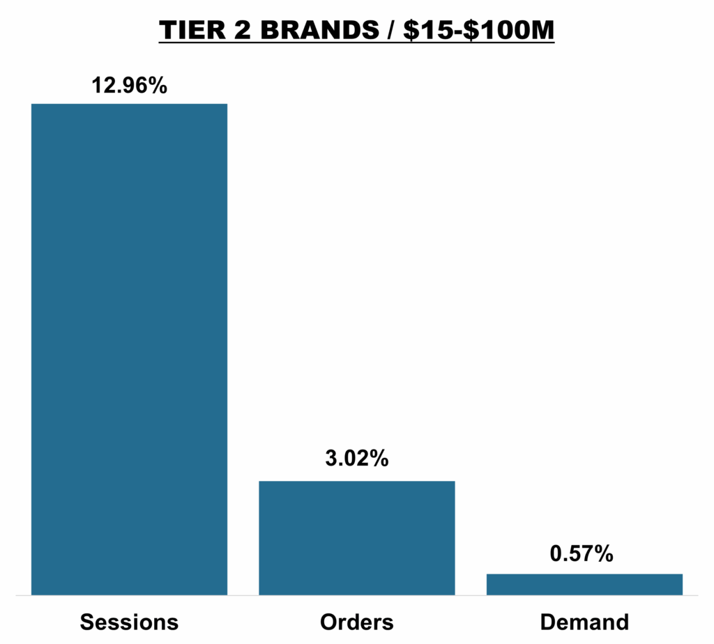 In August, Tier 2 brands experienced conversion challenges despite a notable uptick in traffic. Sessions rose by +12.96%, signaling sustained consumer interest and engagement. However, orders increased by just +3.02%, and overall demand saw a marginal lift of +0.57%, underscoring persistent friction in the path to purchase.