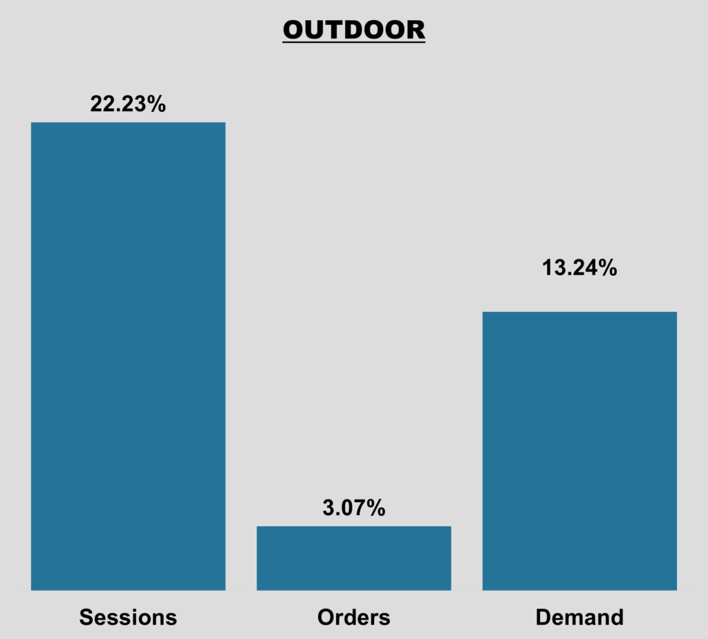 Outdoor brands saw strong growth compared to last April. An 18.09% rise in sessions highlights effective awareness and acquisition efforts, with outdoor retailers drawing significantly more visitors. Orders grew by 7.18%, though the disparity with session growth suggests opportunities to improve conversions. Demand climbed 8.92%, indicating strong interest in outdoor products.