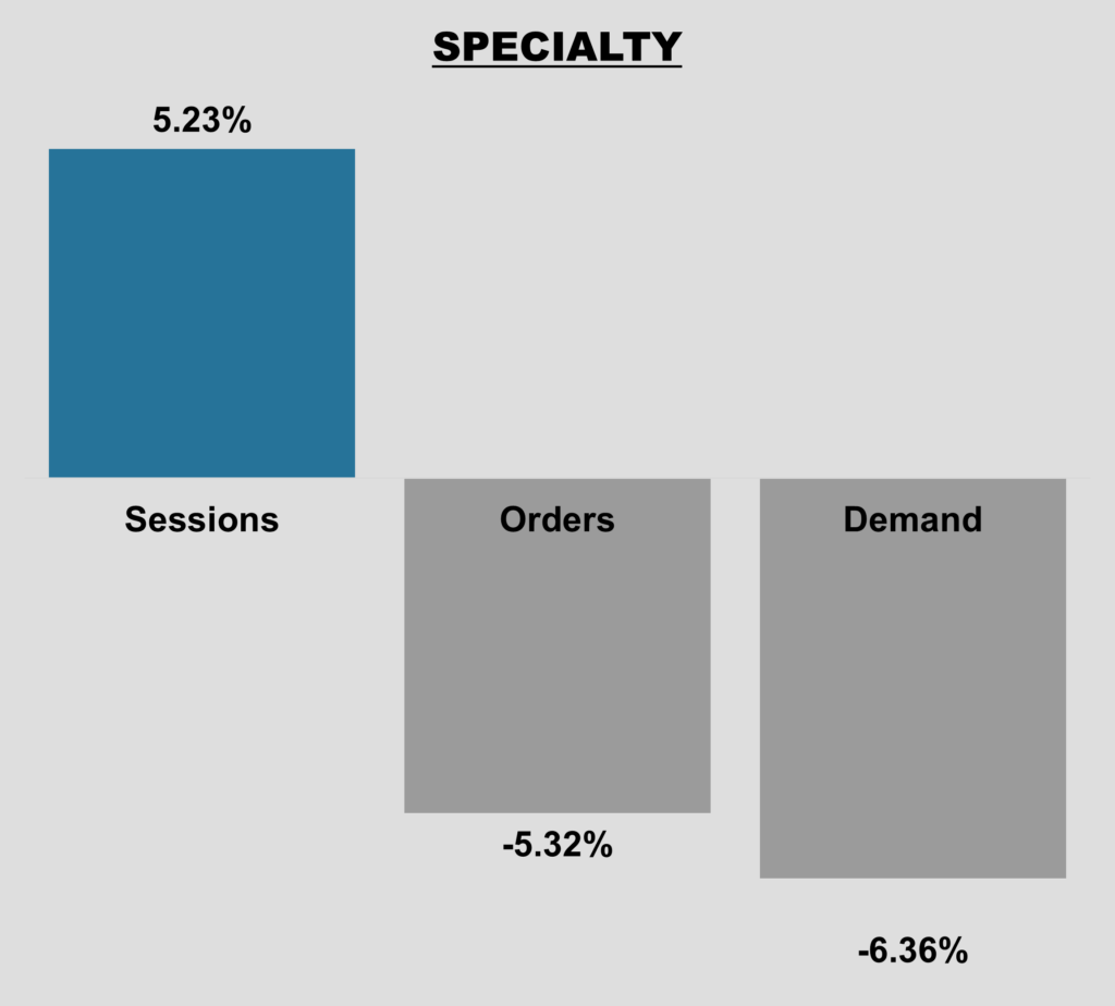 May sessions were up +5.23% for specialty brands. However, compared to last year, orders were down -5.32%, and demand was down -6.36%. Despite a slight increase in sessions, the decline in both orders and demand points to tightening discretionary spending.