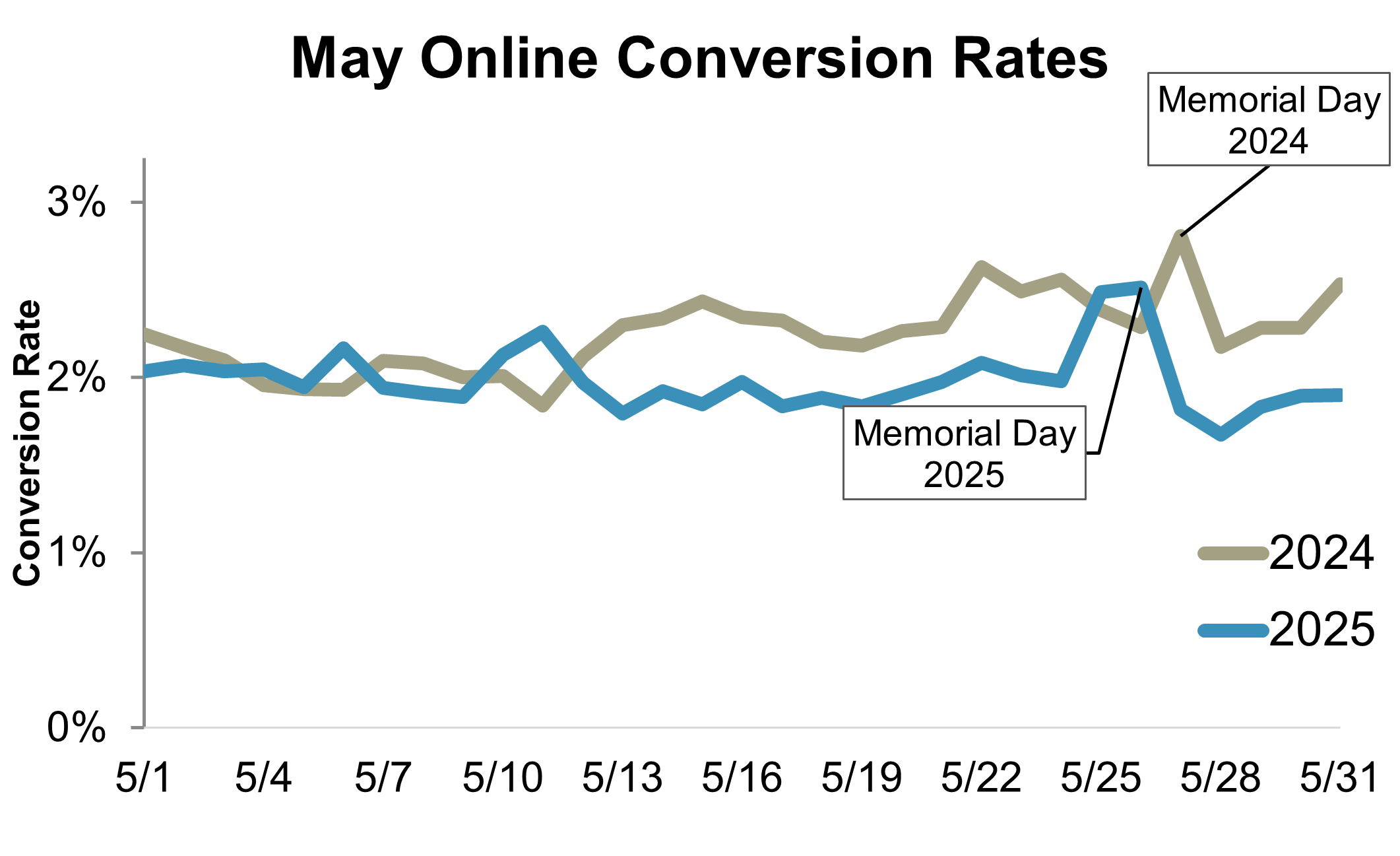 Many brands are finding it increasingly challenging to drive conversions. Online conversion rates declined from an average of 2.24% in May 2024 to 1.99% in May 2025, a 0.25 percentage point decrease. While a few days in early May showed slight improvements, they were outweighed by lower conversion rates later in the month. Most of the decline occurred in the second half of May, with 18 days showing a drop greater than 0.3%.