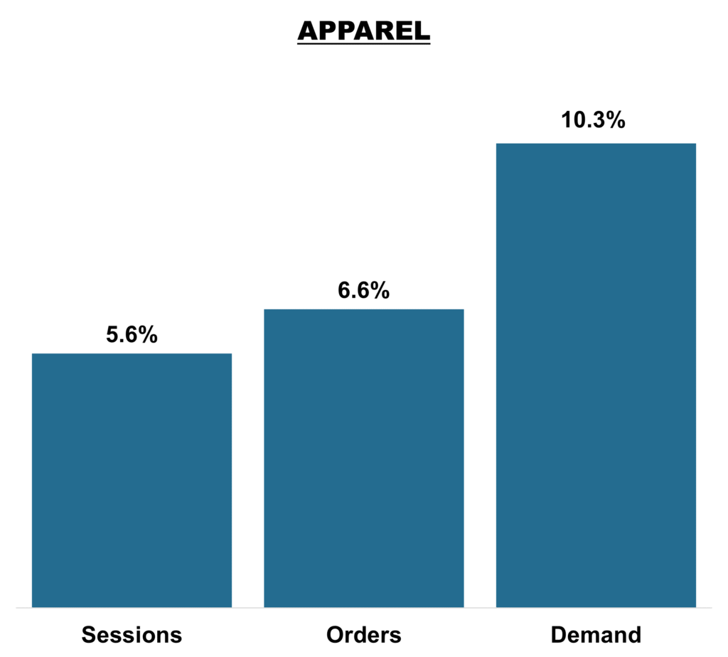 Sessions rose 5.6%, while orders surged 6.6%, reflecting stronger conversion efficiency compared to October. Demand grew 10.3%, continuing to outpace traffic and orders, though at a slightly slower rate than last month. This trend suggests consumers remain highly engaged, with seasonal promotions driving incremental volume even as average order values stabilize. Overall, apparel demand remains healthy, and momentum is strong heading into the holiday season.