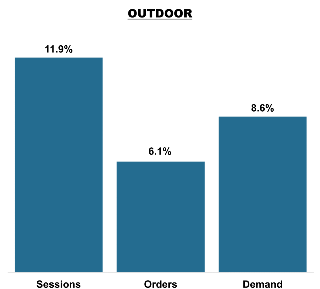 Sessions surged 11.9%, marking a sharp increase in consumer engagement during the holiday season. Orders rebounded to 6.1%, reversing October’s flat trend and signaling improved conversion. Demand grew 8.6%, though at a slower pace than last month, indicating a shift toward lower-priced or promotional items compared to October’s premium-driven growth. Overall, the Outdoor category shows strong traffic momentum and healthier purchase activity, positioning well for continued holiday performance.