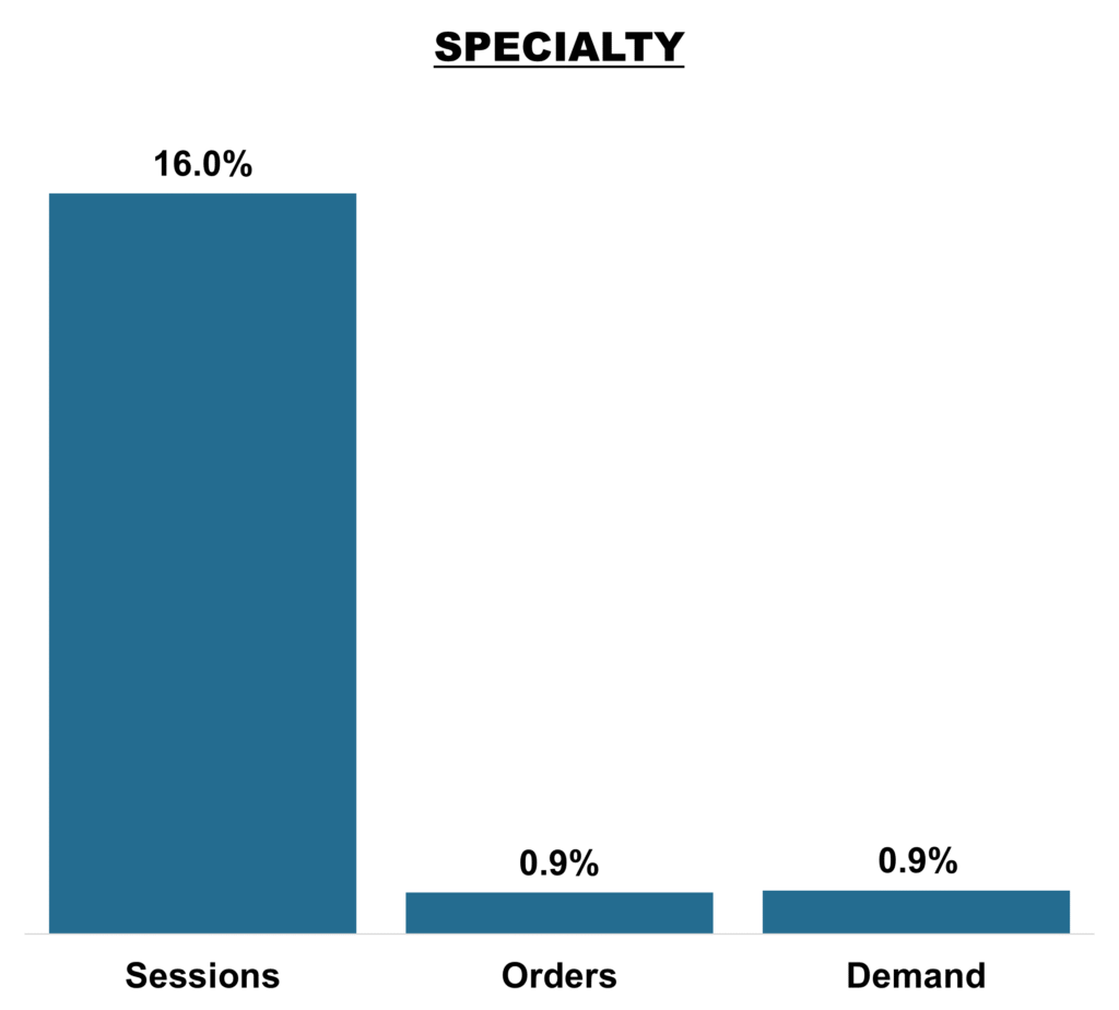 Sessions remained strong at 16%, reflecting sustained consumer interest. Orders improved slightly to 0.9%, reversing October’s decline but still trailing behind traffic growth. Demand grew just 0.9%, signaling stabilization after last month’s sharp drop but highlighting ongoing challenges in conversion and revenue efficiency. While engagement is healthy, the Specialty category requires targeted strategies to capitalize more effectively on high traffic and drive stronger holiday performance.