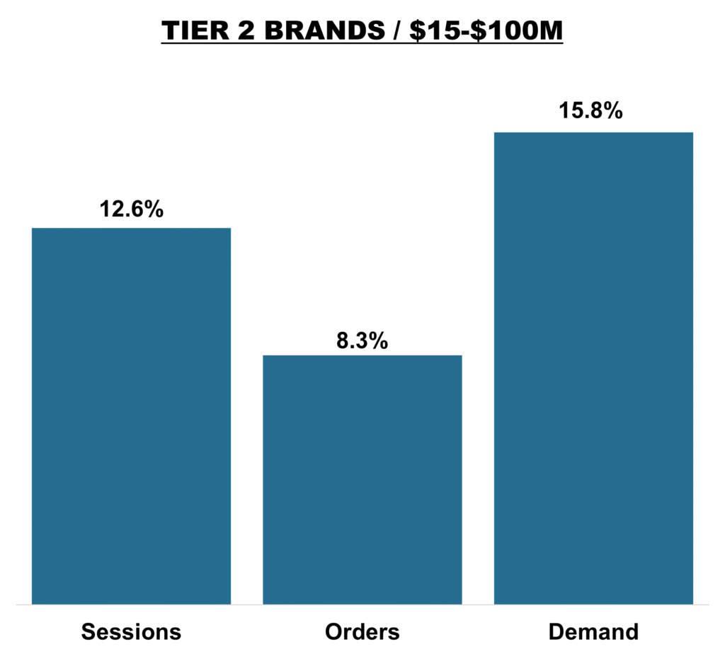 Sessions grew 12.6%, maintaining strong engagement despite a slight slowdown from October. Orders held steady at 8.3%, reflecting consistent conversion performance. Demand surged 15.8%, significantly outpacing traffic and orders, driven by higher average order values and effective holiday merchandising. Overall, Tier 2 brands show robust momentum and strong revenue efficiency heading into peak season.