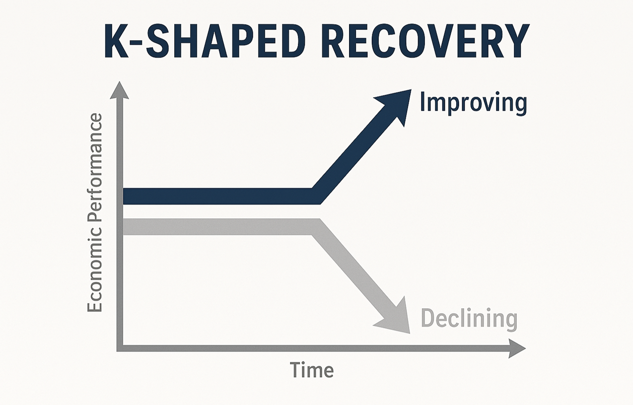 The term “K-shaped recovery” describes an economic rebound that is uneven. Instead of all sectors improving at the same pace, some recover quickly while others continue to struggle. Picture the letter K: the upward stroke represents thriving sectors, the downward stroke those falling behind.
