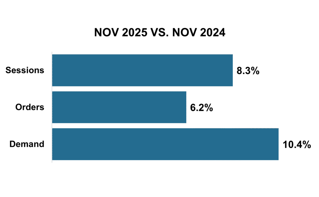 Retailers delivered strong November results. Sessions rose 8.3%, orders 6.2%, and demand 10.4% year-over-year. Despite surveys signaling cutbacks, consumer spending proved resilient.