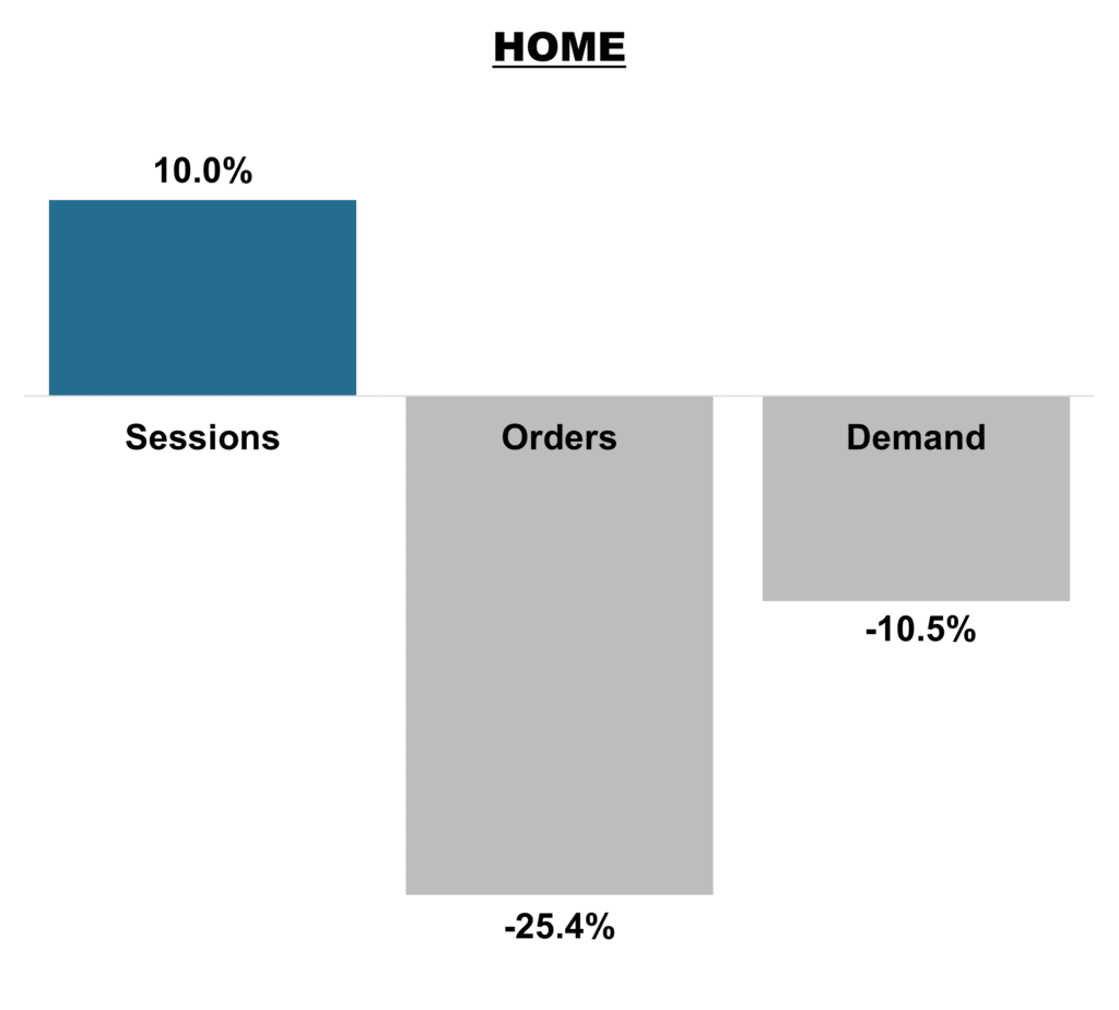 The Home category showed mixed year-over-year results, with sessions up 10%, but orders down -25.4% and demand declining -10.5%. The traffic increase suggests strong shopper interest, yet the steep drop in orders points to conversion challenges, possibly due to softer consumer intent, reduced promotional activity, or higher price sensitivity. Despite more visitors, fewer are completing purchases, indicating a need to reassess on-site experience, offer strategy, and product positioning.