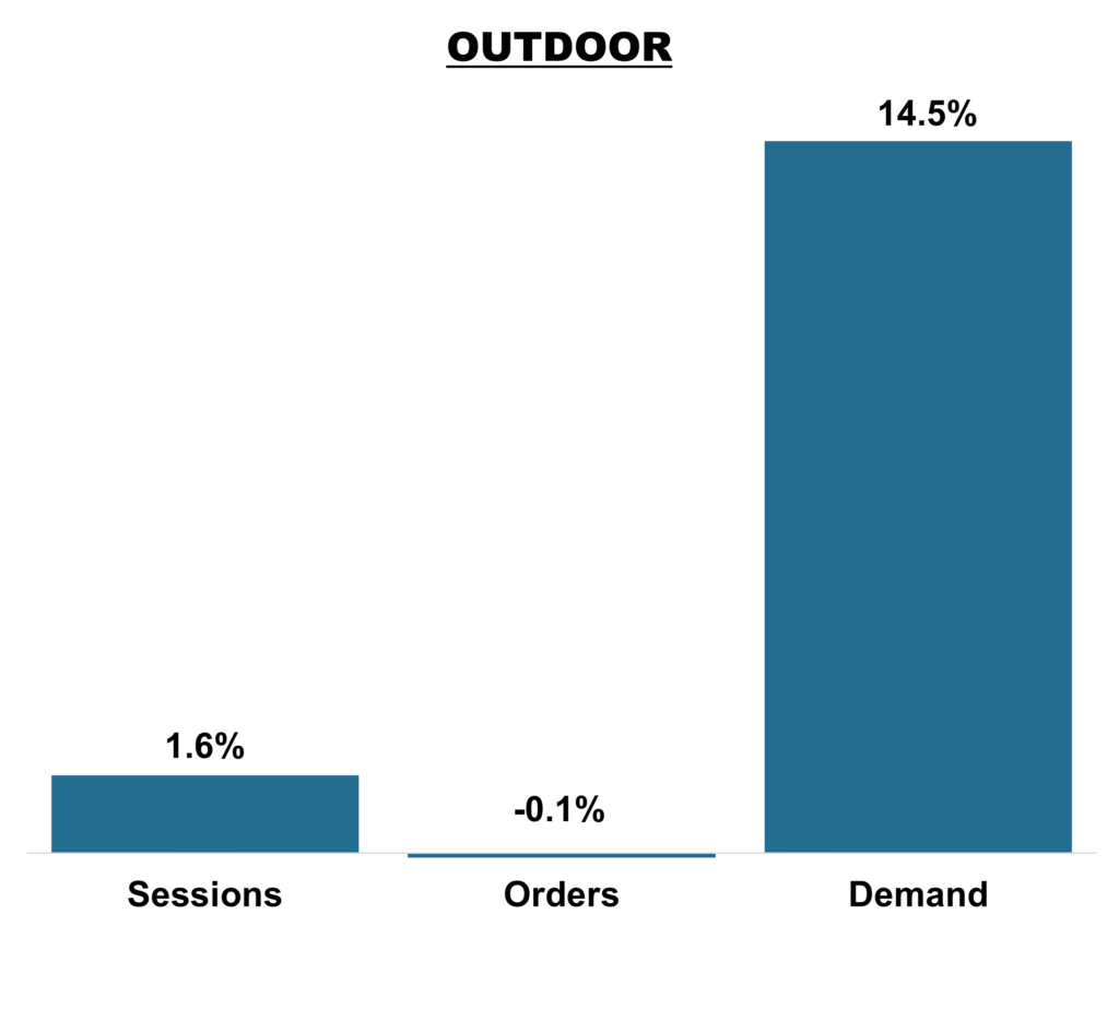 The Outdoor category saw modest year-over-year traffic growth with sessions up 1.6% and orders nearly flat at -0.1%, while demand surged 14.5%. This indicates that although purchase volume held steady, shoppers are spending significantly more per order, due to higher price points or a shift toward premium products. Overall, the category shows stable engagement and strong revenue efficiency, suggesting resilient consumer interest heading into the holiday season.