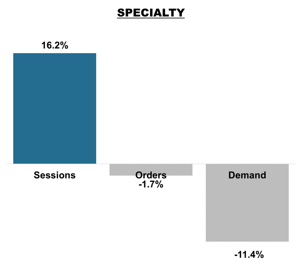 The Specialty category experienced strong traffic growth with sessions up 16.2%. However, orders fell -1.7% and demand decreased -11.4%. While more visitors came to the site, fewer are converting and overall spending decreased, suggesting conversion or pricing challenges. This gap highlights an opportunity to optimize the shopping experience and promotions to better translate high interest.