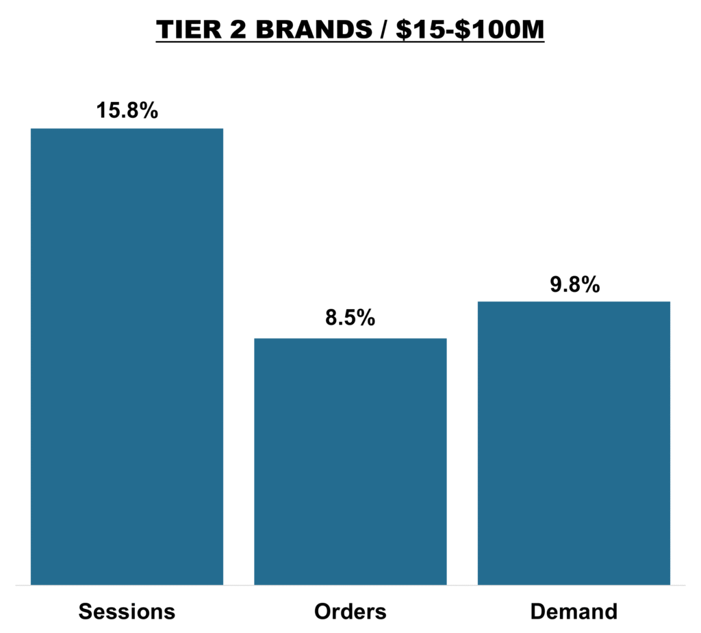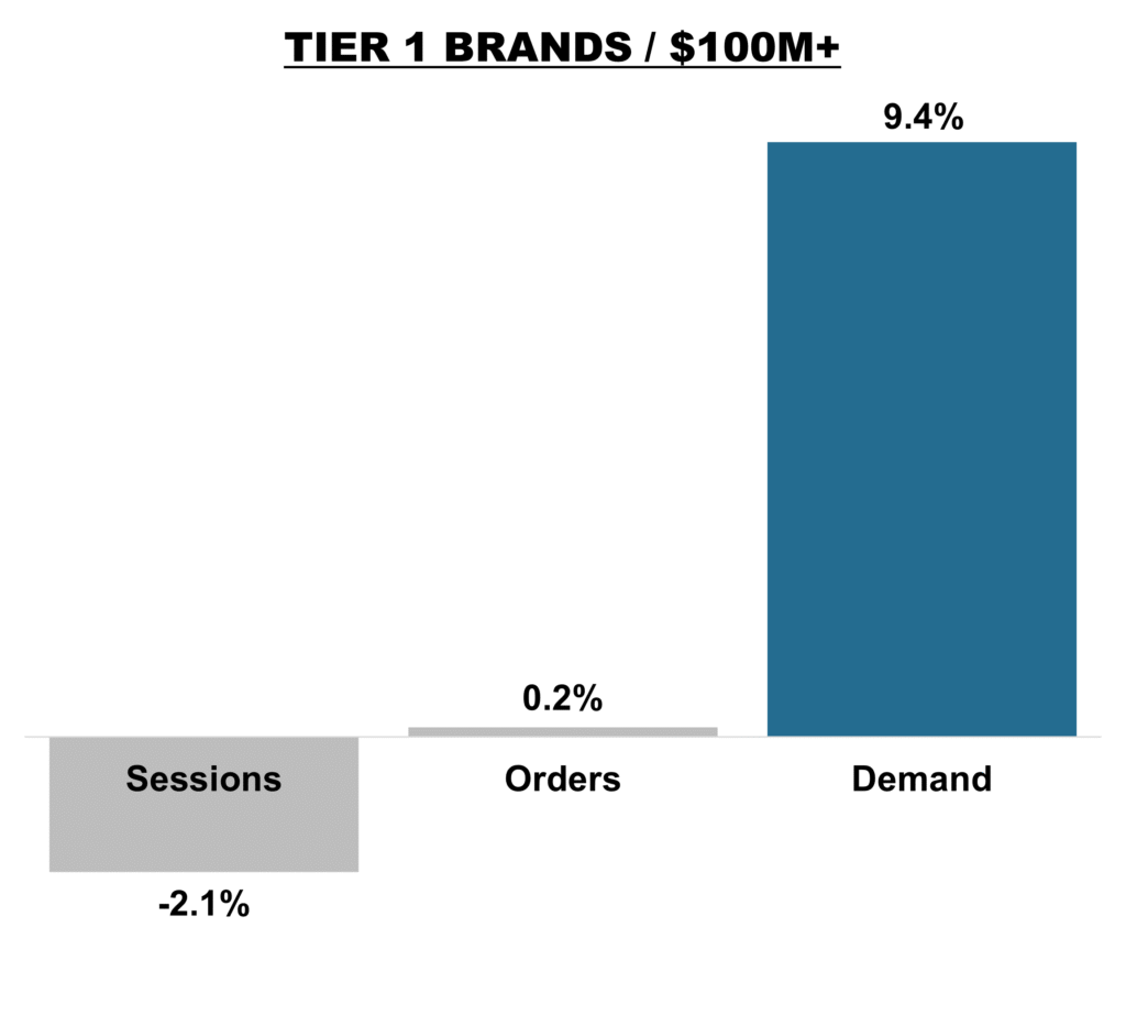 Tier 2 brands delivered strong year-over-year growth, with sessions up 15.8%, orders rising 8.5%, and demand up 9.8%. The broad-based gains reflect healthy traffic expansion and solid consumer conversion, supported by effective marketing and product strategies. While order growth trailed traffic slightly, overall performance signals robust momentum and strengthening shopper engagement heading into the holiday season.