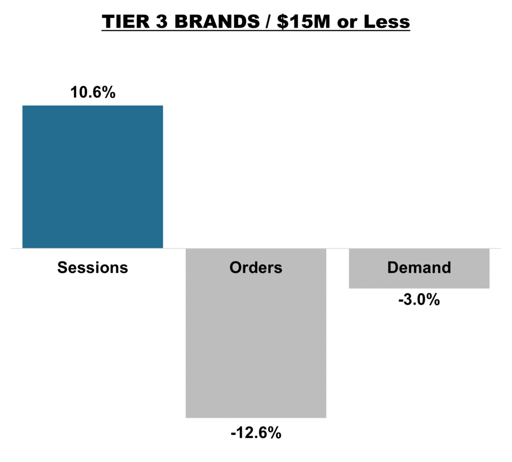 Tier 3 brands saw solid traffic growth with sessions up 10.6%, but orders declined -12.6% and demand fell -3% year-over-year. The gap between rising site visits and declining sales suggests weaker conversion performance and potential pricing or competitiveness challenges. Despite increased shopper interest, smaller brands may need to refine targeting, promotions, and on-site experience to better translate traffic into revenue.