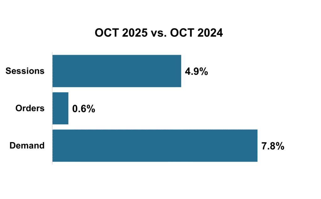 Sessions rose 4.6%, orders increased 2.8%, and demand surged 13.3%. Strong revenue growth outpacing traffic and orders suggests higher average order values and healthy consumer spending. While conversion efficiency can improve, overall momentum remains positive heading into the holiday season.