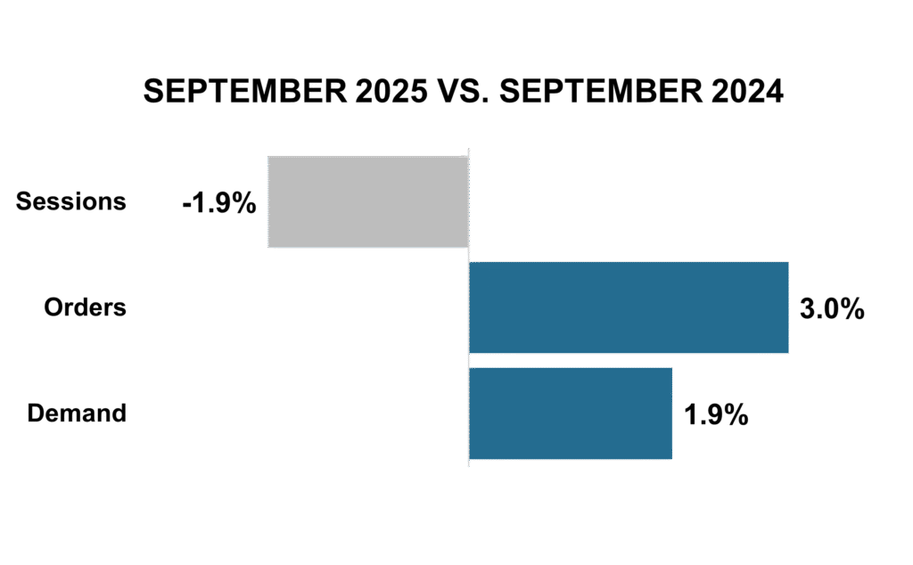 Overall, sessions declined -1.9% versus last September, but improved conversion lifted orders by 3% and demand by 1.9%. Although fewer shoppers browsed, those who did were more likely to make a purchase.