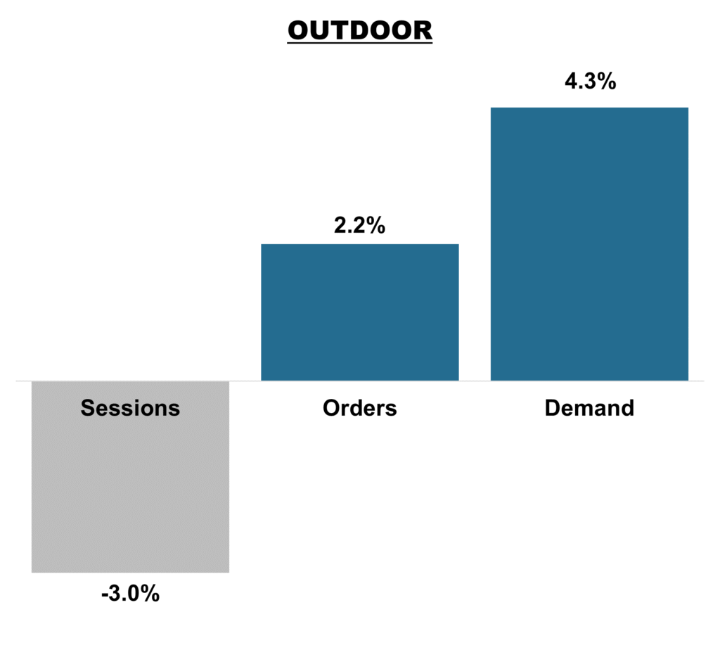The outdoor industry showed a mixed recovery in September following August’s decline. Sessions declined from a +3.8% increase in August to a -3% decrease in September, signaling weaker site traffic and engagement.
